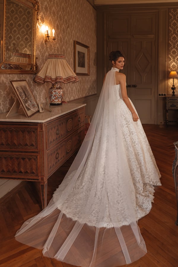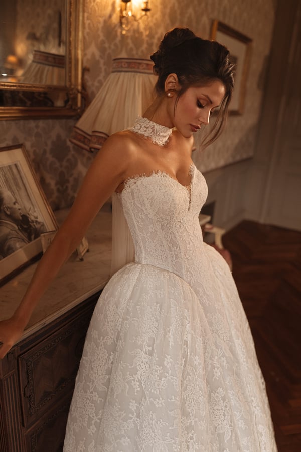 Ballkjole i Chantilly-blonde med blomsterstruktur og korsettliv med hjerteutringning. Skjørtet har flere lag med volanger som kan justeres fra A-linje til fyldig fasong.
