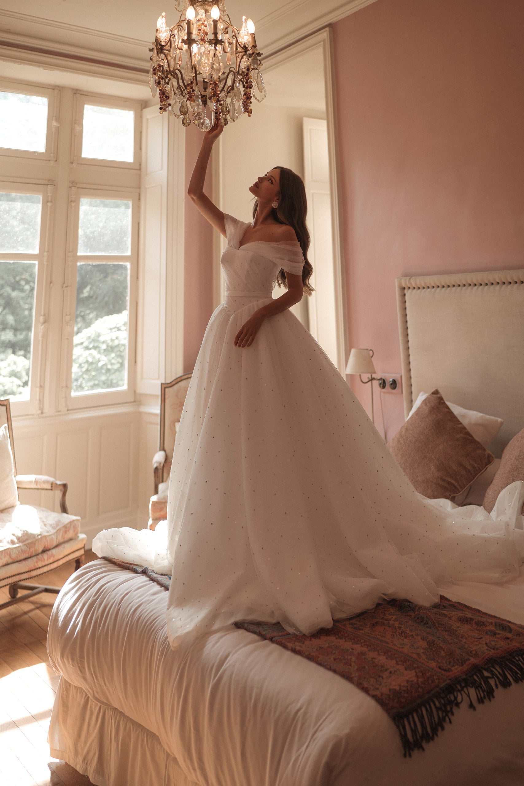 Camilla fra Katy Corso er en glitrende og romantisk kjole. Den er laget i lett stoff med skinnende detaljer. Perfekt for en brud som ønsker en romantisk og eventyrlig stil.