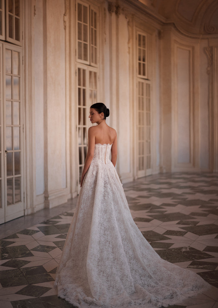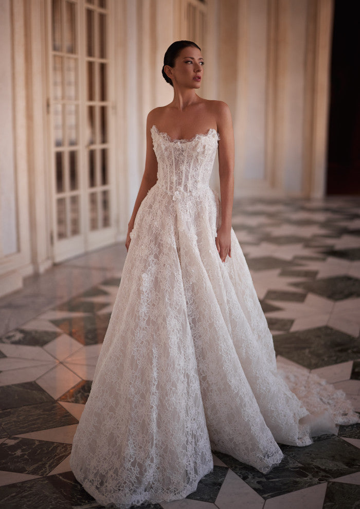 En romantisk brudekjole i myk blonde. Korsettet fremhever midjen og gir en elegant, prinsesseaktig silhuett. Kjolen har ermeløs utringning, 3D-blomster og et gulvlangt skjørt med splitt.