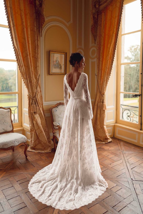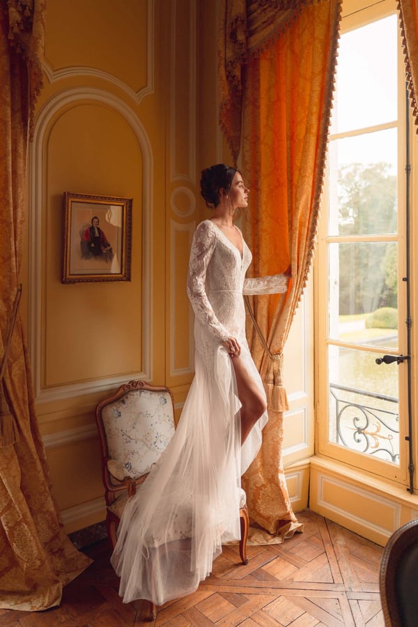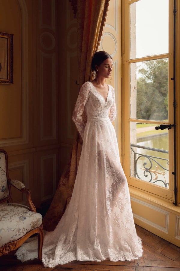 Blondekjole med blomsterstruktur, lange ermer og V-utringning. Smal fasong med lett, gjennomsiktig mesh over bena.