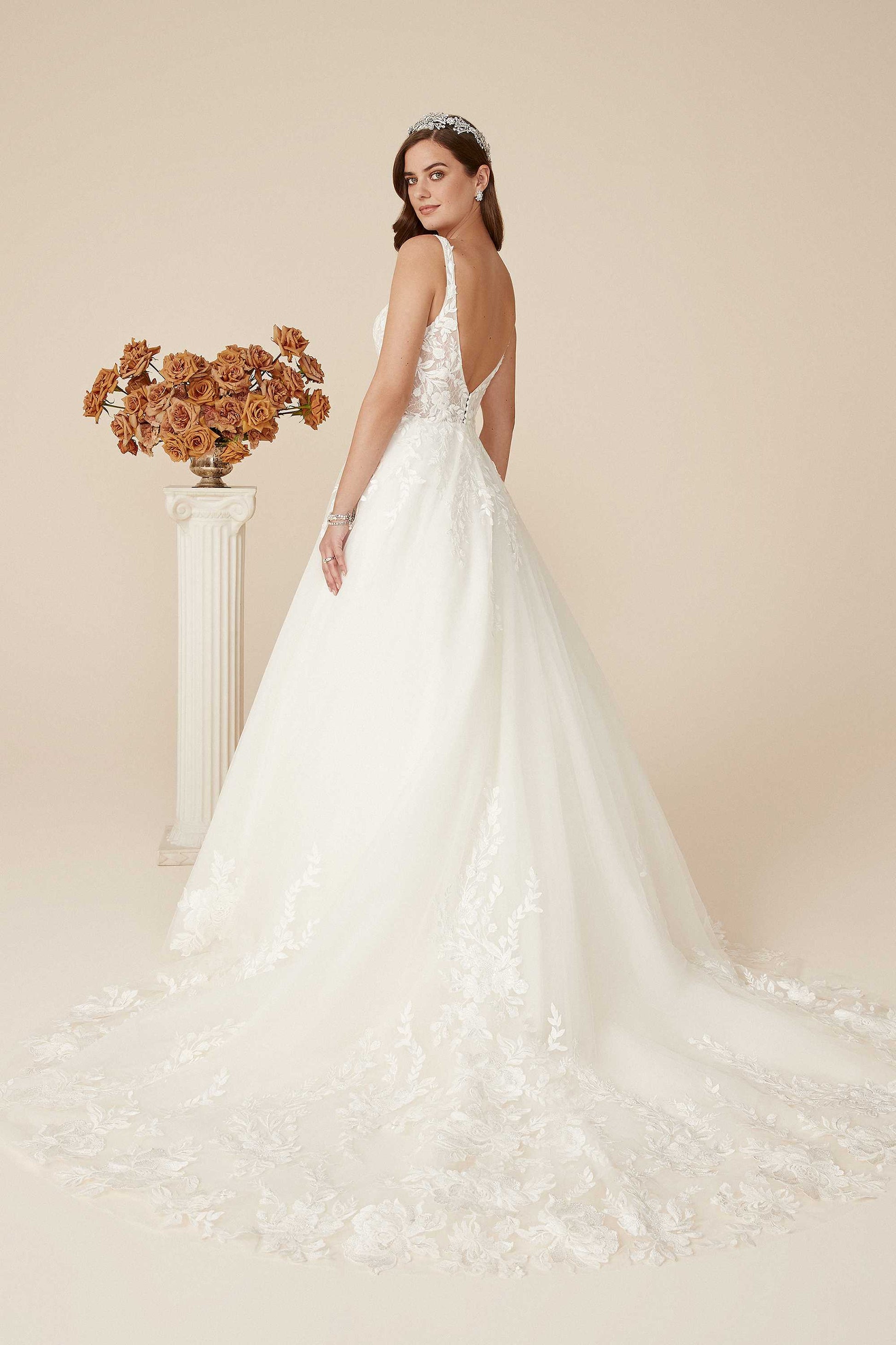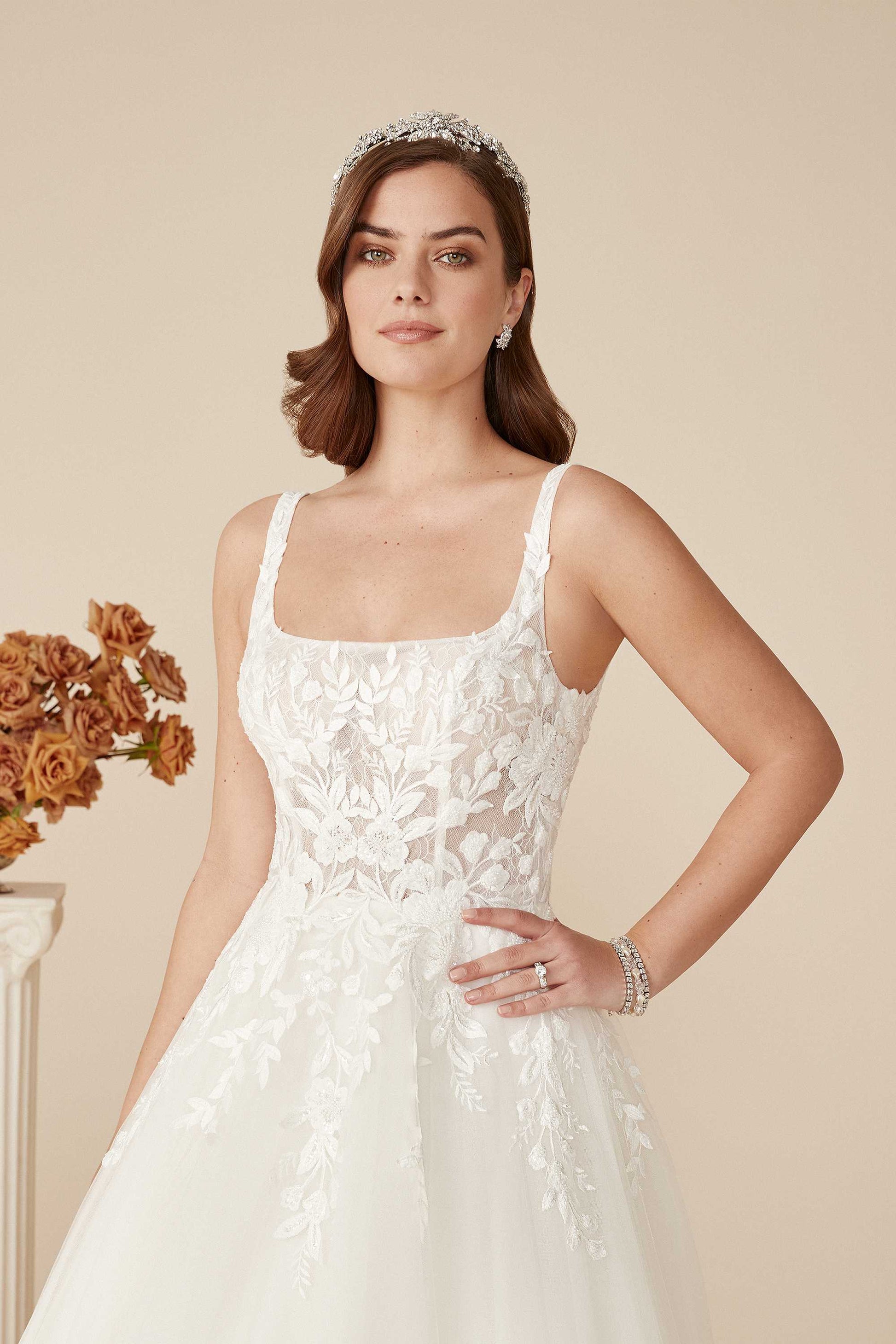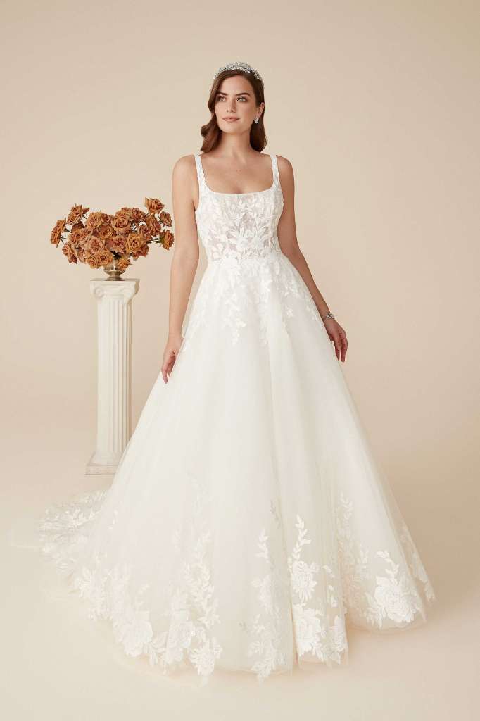 En fantastisk vakker brudekjole med stort og vakkert skjørt! Skjørtet er A-linjet og er i tyll. Kjolen har en moderne firkantet skjæring på toppen med blonder og små perler. Helt nydelig!