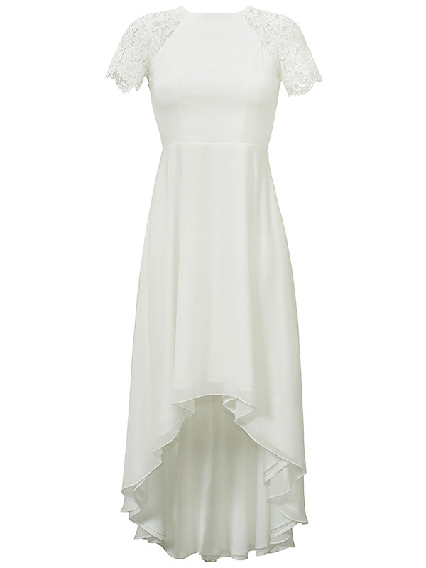 Tøff kjole som er kortere foran og lengre bak / High-Low skjørt. Kjolen har t-skjorte ermer med blonde-detaljer og en florlett skjørt i chiffon. Nydelig kjole!