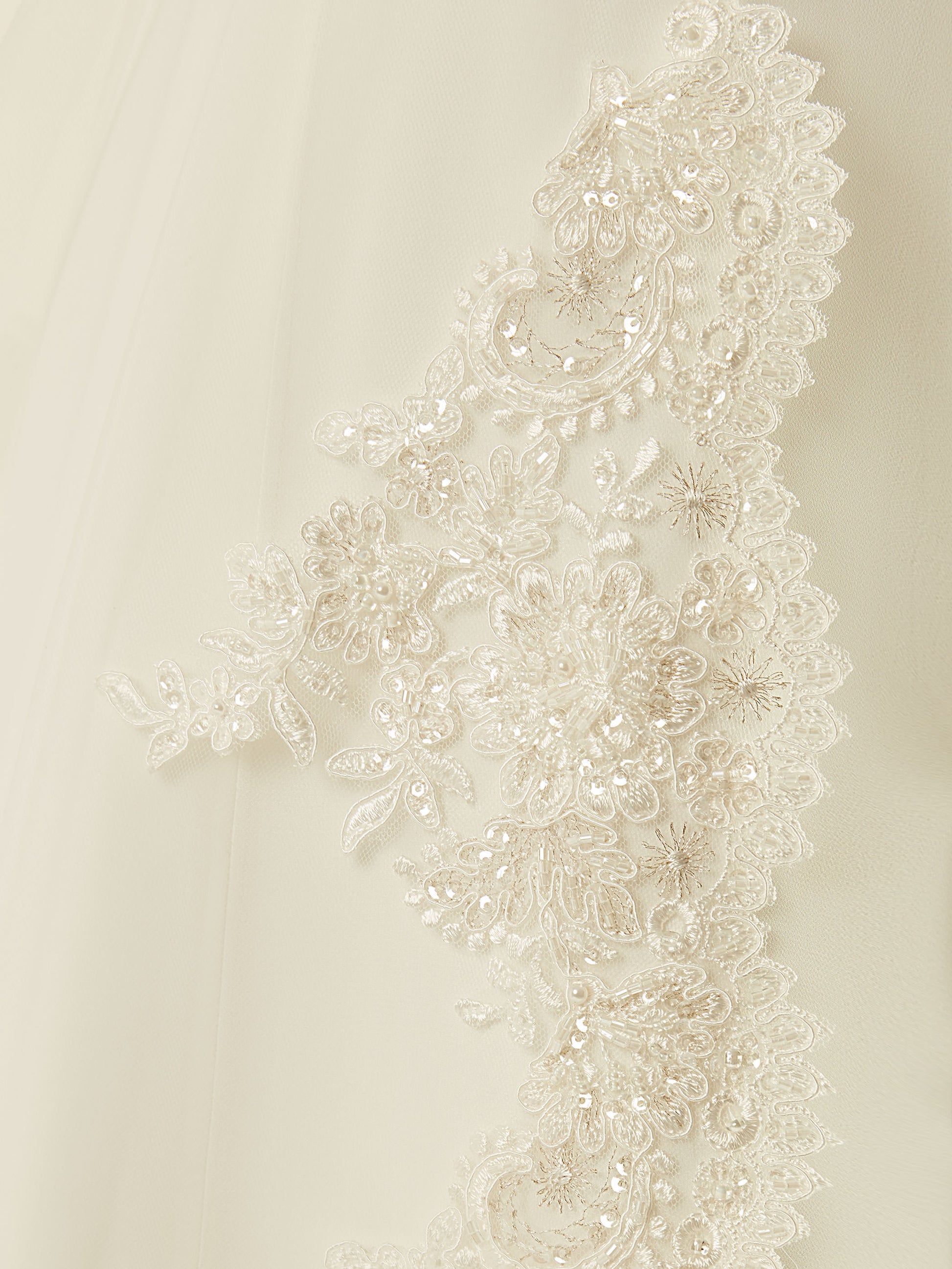Et av våre mest eksklusive slør med en bred utsmykket blondekant. Sløret har en lengde på 280cm. Det perfekte tilbehøret til din brudekjole!