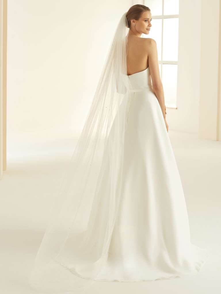 Slør med smal kant og myk tyll. Sløret har en lengde på 220cm og har krystaller spredt utover sløret. Brudesløret kommer med en kam, slik at det enkelt kan festes i håret.